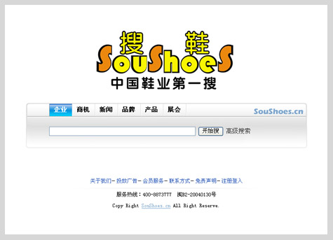 2007年4月19日由中國(guó)鞋網(wǎng)全力打造的專業(yè)鞋類搜索引擎:中國(guó)鞋業(yè)第一搜www.soushoes.cn(搜鞋網(wǎng))隆重上線,為鞋類行業(yè)提供更方便快捷的搜索服務(wù)