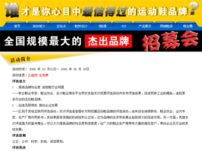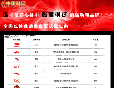 2006年3月-6月,由中國鞋網做為鞋類行業第一網絡媒體發起,各鞋行業媒體聯合推廣的針對民族運動鞋品牌進行首屆全國性調查投票活動:我心目中最信得過的運動鞋品牌。所有國內的知名品牌踴躍參加并獲得一致好評。