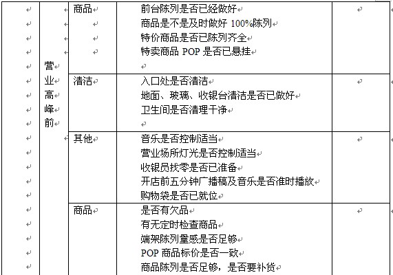 店長的管理內容大部分是復雜的例行事務,因此,店長只要把握店內作業環節的重點,就能基本保證店鋪作業的正常進行。下表是某店鋪總結的店長一天之內的業務核對表,可供參考。