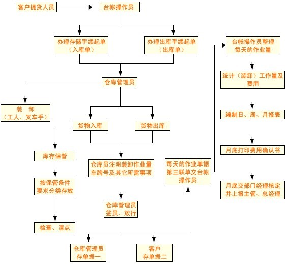 倉(cāng)儲(chǔ)存取貨原則上應(yīng)隨到隨存、隨需隨取,但考慮到效率與安全,有必要制訂作業(yè)時(shí)間規(guī)定。商品進(jìn)出庫(kù)要做好登記工作,以便明確保管責(zé)任。倉(cāng)庫(kù)管理流程圖見(jiàn)以下: