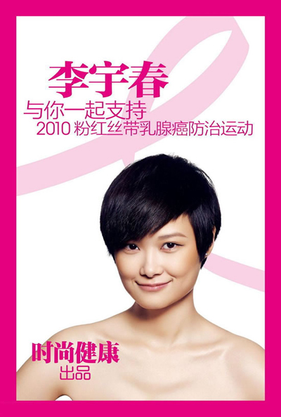 2010年度《時尚健康》粉紅特刊封面大片,一改往年三位代言人的模式,除了力邀人氣演員海清、清純公主陳怡蓉、星女郎張雨綺、范志博、楊雪、陳紫函、唐嫣、江映蓉以及日本女星田中千繪等人共事粉紅風潮,更有李宇春震撼出鏡,勇敢站在鏡頭前拍攝《時尚健康》一年一度的10月號震撼封面。圍繞今年的主題“粉紅絲帶,現在開始行動”,雙封面特刊大聲呼吁年輕女性參與到粉紅絲帶乳腺癌防治的陣營中來,將“早預防,早發現,早治療”乳腺癌的健康理念,從年輕一代開始,貫徹到底。