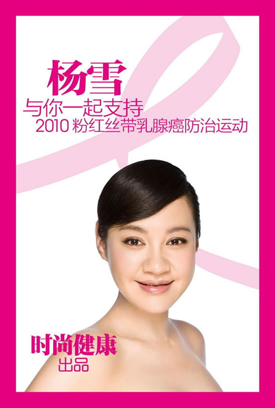 《時尚健康》作為該活動在中國地區的媒體發起者和積極推行者,自2003年將粉紅絲帶引入中國以來,每年十月的“粉紅封面”都會精心選擇本年度中國最具代表性與影響力的女性代言,拍攝視覺震撼力十足的粉紅大片。從2005年以李冰冰、鄔君梅、鐘麗緹代言開始,幾年來,吳君如、伊能靜、蔣勤勤、趙雅芝、吳佩慈、李小冉、陳沖、馬伊俐、柯藍、毛阿敏、寧靜、郝蕾等十數位粉紅大使,先后以健康的美感傳達中國女性的溫柔與力量。