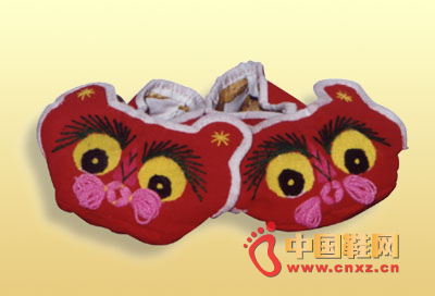 【-鞋文化】這是四川阿壩羌族幼童穿用的鞋。鞋底和鞋幫用整塊紅布縫制,鞋頭另用一塊紅布剪出虎頭形狀用線縫上,虎頭用綠、黃、黑、粉色毛線繡出五官,鞋口及虎頭邊沿均以白布鑲邊。這雙鞋造型古樸趣致,寄寓了長輩關愛之心。