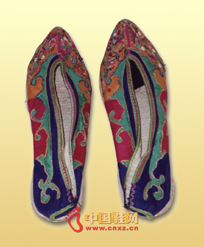 【-鞋文化】黎族主要聚居在我國的海南省,有九個支系,各有特點。相傳,黎族是從中原逐漸南遷到海南的古老民族,所保存的傳統文化中有很多就是遠古的遺存,其中以紋身最具特色。這里展出的黎族繡花鞋為千層底,頭微翹,鞋面以各色布塊拼接而成;鞋面通體繡有勾云紋,以金錢勾勒,鞋前部用彩色絲線綴以亮片繡出"甘工鳥"紋,寓意吉祥。鞋頭用雙色絲線致密地滾邊。該鞋的紋飾相當華麗,色彩豐富。