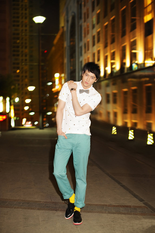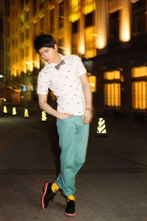 在接受名模張亮的采訪時,同時也與張亮探討了經。在拍攝中,以青色仔褲和明黃色襪子,搭配白底印花polo衫,使整個人看起來明媚清爽。點睛之筆小領結,更是讓整體造型增添了一些正式感,而付辛博笑稱這身打扮非常適合約會重要朋友。