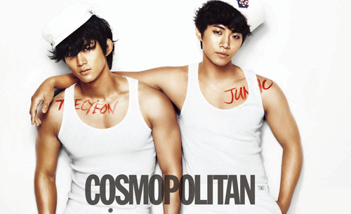 【中國鞋網-名人圖庫】韓國男團2PM的成員澤演和俊昊日前為時尚雜志《COSMOPOLITAN》拍攝了一組全新寫真。兩人身穿白色背心,裸露著健碩的古銅色肌肉,眼神透著野性,大膽狂野。