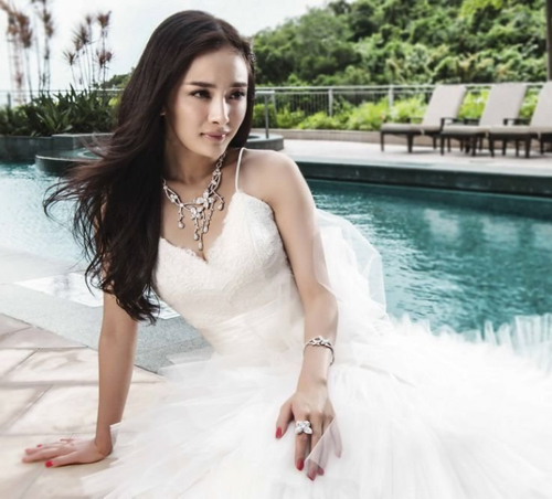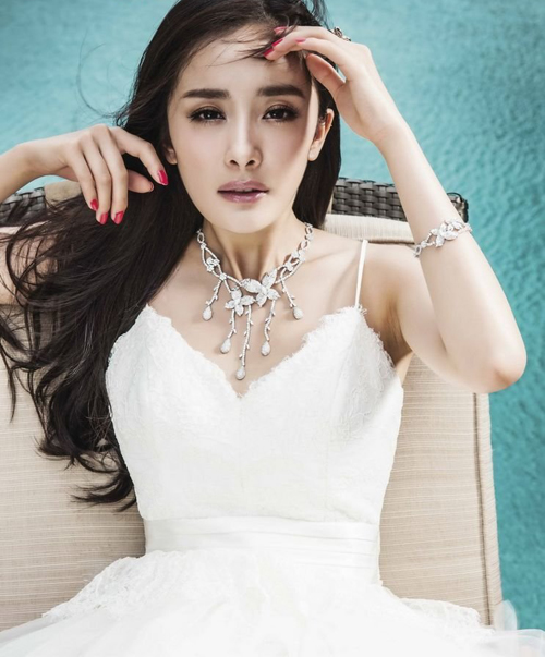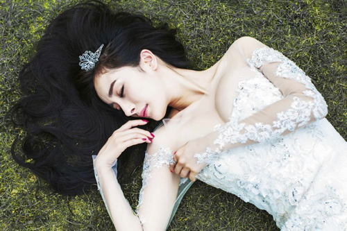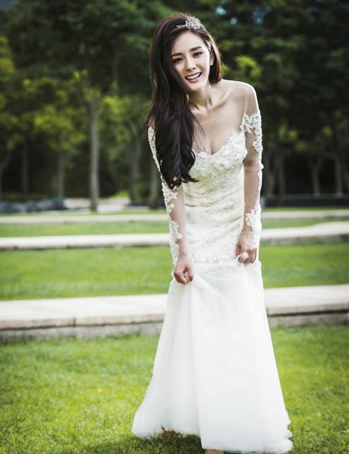 【中國鞋網-名人圖庫】近日,事業愛情雙豐收的小花旦楊冪為香港著名新娘雜志《大日子》拍攝了一組婚紗禮服寫真。寫真中楊冪或身穿甜美禮服短裙流連水波蕩漾的游泳池畔,或著一襲純白優雅婚紗徜徉青草地中,展現了其甜美優雅中不失清新感的獨特魅力。