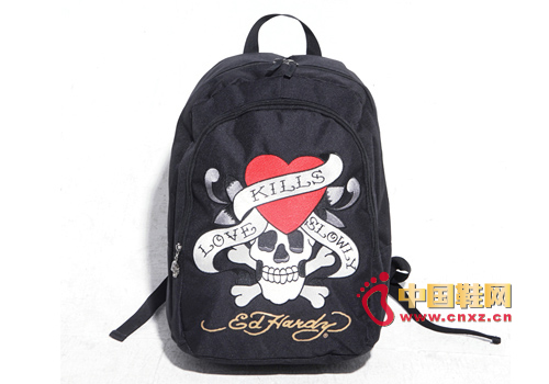 中國鞋網1月6日訊,埃德·哈迪 (Ed Hardy) 以設計大膽的街頭潮流時裝聞名.將富有東方色彩的紋身融入到設計中,注入復古朋克元素及街頭文化,重新定義了“街頭時尚” (Street Fashion),把Ed Hardy 塑造為極具美國精神的品牌。這款新品2013 S/S「復古LOVE KILLS SLOWLY經典刺繡后背包」,包面上的愛殺圖騰概念源自街頭刺青文化開端流行的年代,為1972年DON ED HARDY 創立人經典之一的原創圖騰,ED HARDY翻新復古新創意!
