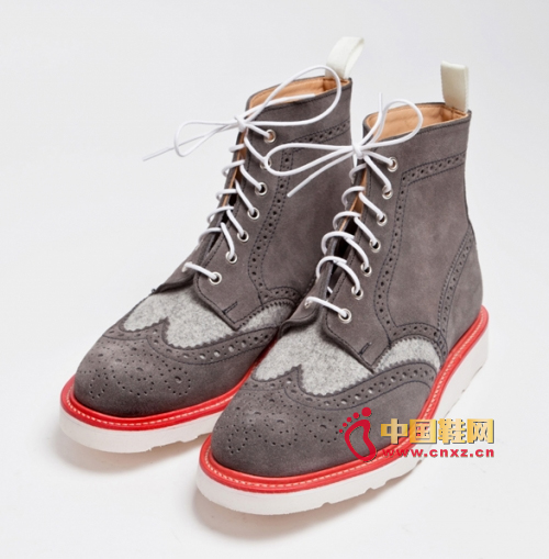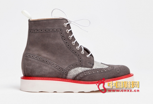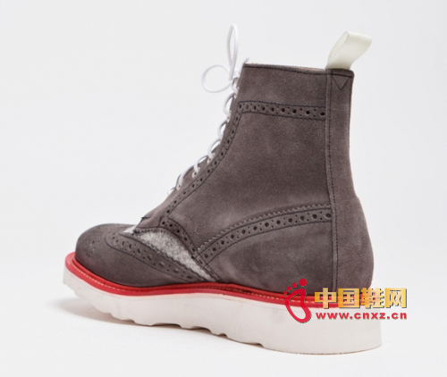 中國鞋網1月7日訊,來自紐約的鞋款設計師Mark McNairy近年來可謂是炙手可熱,多次以其獨特的風格沖擊著鞋履圈的價值觀念與設計界限。現在又與瑞典潮鋪Tres Bien再度聯手推出系列靴款,因其產自英國,整體風格也被打上濃濃的“made in England”的標簽。靴身由灰色羊毛與麂皮面料拼接而成。鞋身搭載雕花圖案設計,鞋底與鞋身的紅色縫邊可謂是一亮點,溫暖感滿載的同時,也提升了整體的存在感,是十分適合冬季的靴款。動心的潮友趕緊下手!
