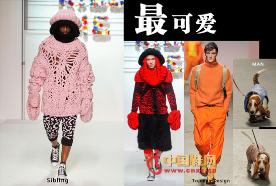 粉紅色的大毛衣大手套大帽子包裹得嚴嚴實實如同新生的小寶貝,或者是穿著鮮艷戴著小帽背著雙肩包如同小學生般的模特,還有穿著馬甲走上秀場的狗模特,倫敦男裝周也有可愛溫馨的一面。