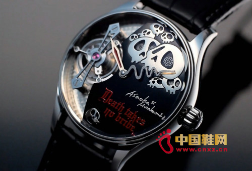 中國(guó)鞋網(wǎng)1月27日訊,大家最熟悉的村上隆,是他的“村上圖騰”,是五顏六色的太陽(yáng)笑臉花,還有LV的大眼睛、櫻桃。其實(shí)在骷髏的造詣上,村上也是風(fēng)格獨(dú)特。作為藝術(shù)家,商業(yè)單品不斷,但并無(wú)濫造,比如這款花了3年時(shí)間策劃、設(shè)計(jì)和制造的 - Death Takes No Bride陀飛輪腕表。跟東京(專(zhuān)賣(mài)店)的獨(dú)立制表工作者Hajime Asaoka惺惺相惜合作而成。除了顯現(xiàn)日本工匠手左高超精密的陀飛輪結(jié)構(gòu),最吸引人莫過(guò)于右上角的“村上骷髏”,這些骷髏不止一次出現(xiàn)在他的畫(huà)作中。喜歡太陽(yáng)花的人也別失望,因?yàn)槟阍倏拷纯,精密?xì)小的太陽(yáng)花就藏在骷髏的眼中!扭曲的表針,兩人的凸雕簽名,無(wú)處不顯示這枚藝術(shù)腕表的高貴。