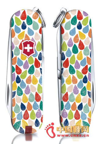 【中國鞋網-風尚奢品】誕生于1884年的瑞士維氏軍官刀(Victorinox),多年的研制與創新使軍刀的每個組成部分都達到了最佳造型,具有最完善的功能。而經典的外觀 - 瑞士紅一直是非常強烈的認知標識。但是否消費者不再滿足于單一的紅色?去年VICTORINOX與網上創作平臺JOVOTO攜手舉辦經典瑞士軍刀特別版設計比賽,在兩個月中就收到了1600多個設計,經過評選團及FACEBOOK專頁投票,選出十個最受歡迎的設計并制成特別版系列,于全球限量發售。彩色的雨點、美國國旗、裂開冰塊都顯示出VICTORINOX藝術時尚的一面,相信很多女孩子會喜歡。