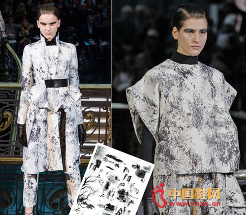 John Galliano 秀場,采用了中國風的水墨元素。模特英氣劍眉、颯爽身姿,體現了東方“文人”灑脫的氣質,那富有設計的水墨印花裙裝,為整個秀場增添了一絲詩情畫意。