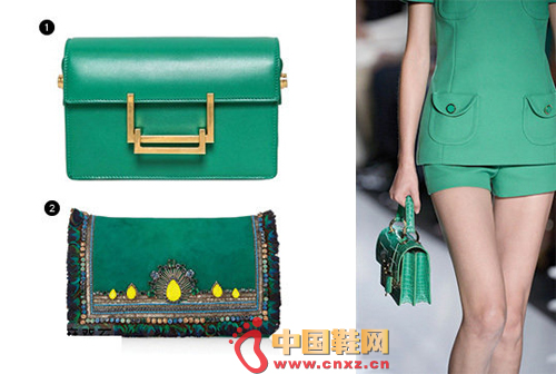 Michael Kors的2013春夏秀場(如圖),可謂是一片綠色的世界,從服裝、手袋到鞋子,無一例外被這抹翠綠覆蓋。如果你還不適應(yīng)將大片翠綠穿上身,不妨從小面積的手袋開始吧。無論是極簡chic風(fēng)的Saint Laurent綠色單肩包(圖1,11284元)還是異域民族風(fēng)情的Matthew Williamson珠寶鑲嵌手拿包(圖2,943英鎊,折合人民幣8750),都是異常搶眼的時尚單品,搭配裙裝褲裝,出席晚宴周末逛街,都非常合適,各位潮人還不心動?