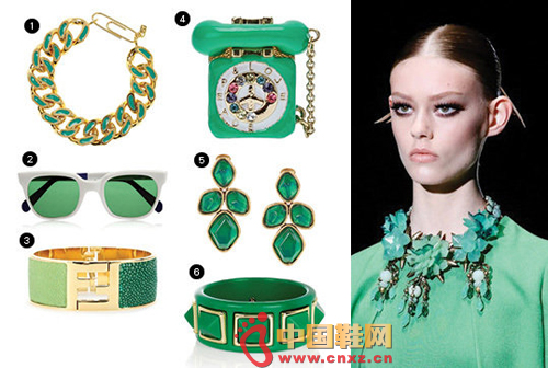 閃閃發(fā)光的翡翠綠總能給人一種迷人的奢華感,同時又保持著一種冷靜的睿智,可謂是低調(diào)的華麗。一個簡單的翡翠綠飾品就能點亮你的整身look,像是Gucci 2013春夏(模特圖)這件禮裙,立體造型的翡翠綠花朵大項鏈無疑最大的亮點。這個春天,不妨就入手一兩件翠綠色的配飾吧,Aurélie Bidermann翡翠綠手鏈(圖1,422英鎊,折合人民幣3915元),F(xiàn)endi撞色手鐲(圖3,405歐元,折合人民幣3273元), Oscar de la Renta水晶耳墜(圖5,216英鎊,折合人民幣2004元)和Kenneth Jay Lane寬手鐲(圖6,57英鎊,折合人民幣528元)都是派對裝的不二之選。而街拍達(dá)人們則不能錯過Sheriff&Cherry綠鏡片墨鏡(圖2,99英鎊,折合人民幣918元)和Me & Zena電話形狀戒指(圖3,42美元,折合人民幣261元)啦!