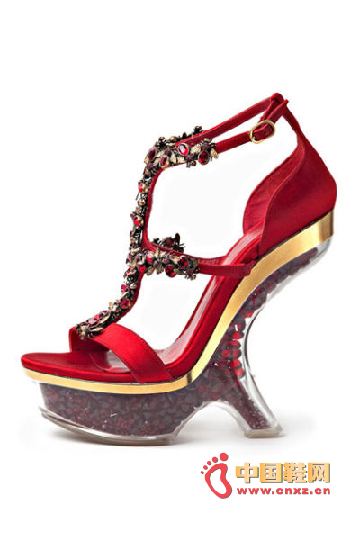 Alexander McQueen 13年春夏的鞋款并不多,但它的鞋跟絕對是不同尋常的。首先鞋跟的形狀與傳統的高跟鞋完全不同,另外用透明材料做了一個鏤空的鞋跟,中間填上紅色碎玻璃。又是一款需要勇氣去穿的高跟鞋。
