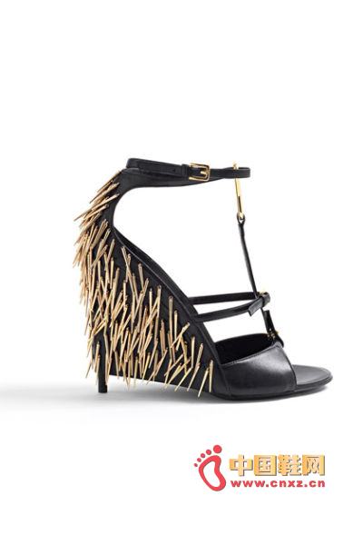 這兩季Tom Ford的女裝造型整體上都顯得很張狂,很華麗。2013春夏的這雙坡跟鞋很像一只刺猬,整個跟上都墜滿了金屬刺,看起來不可接近。很適合率性的女生,或者走搖滾路線的女生穿著。
