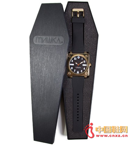 這只腕表來自于Mishka 2013春夏最新系列。標志性的眼球設計依舊亮眼,可手表的金色外殼卻更加奪人眼球。金色的手表外殼成方形做工,而原本的四支鉚釘設計改為了眼球砸花,兼顧潮流氣質的同時也無不散發出華貴氣息。表盤部分的設計同樣很有個性,羅馬數字和阿拉伯數字共有的表盤顯得似乎有些俏皮,而最具代表性的LOGO則成為了表盤上最獨特的裝飾,出現在12點位置。更獨特的設計在于本款手表的表盒是一只華麗的棺材。Mishka的這次華麗轉身玩家們的反應如何,讓我們拭目以待吧!