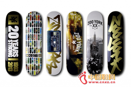 中國鞋網4月25日訊,老牌滑板品牌 Zoo York 由紐約元老級別滑手 Rodney Smith, Eli Morgan Gessner 及 Adam Schatz 三人在 1993 年成立,而歷經二十年歲月后,品牌依舊擁有為數眾多的支持者。本次為了紀念誕生二十周年, Zoo York 推出了六張限量販售的滑板及配套 T 恤,將紐約的帝國大廈、滑板及金色涂鴉字體應用其上,充滿街頭感。這六套滑板將會在指定代理商處販售。