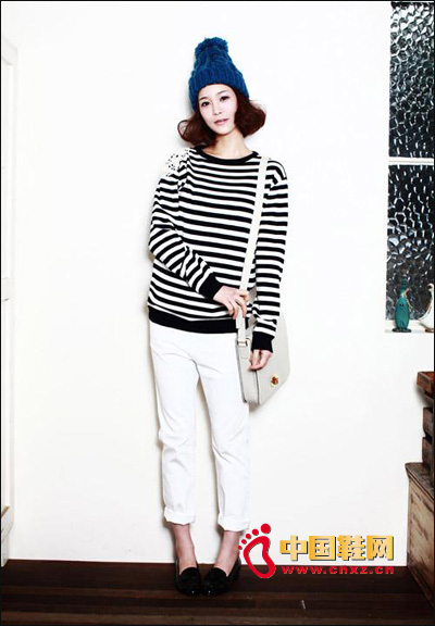 小條紋套頭T混搭白色休閑褲和平底鞋,很有英倫學(xué)院范兒