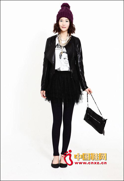 機車風(fēng)外套搭配歐美風(fēng)潮T和平底鞋,是街頭的經(jīng)典搭配