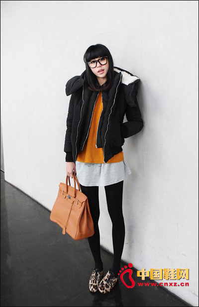 外套的雙拉鏈設(shè)計,增加了穿衣層次,還搭配了豹紋的平底鞋,很有酷感