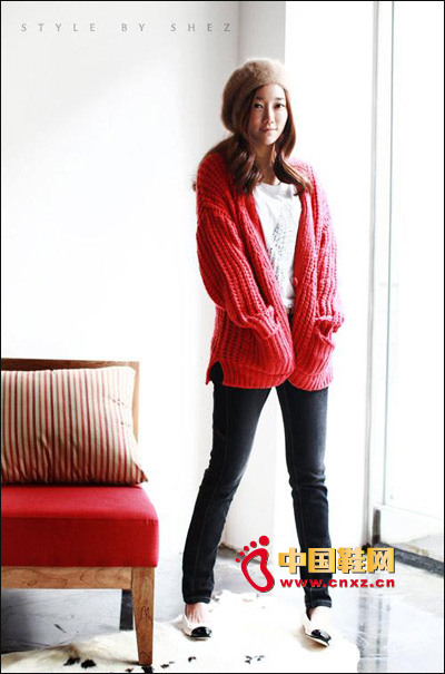 番茄紅的針織外套搭配拼接的平底鞋,透著少女般得可愛味道