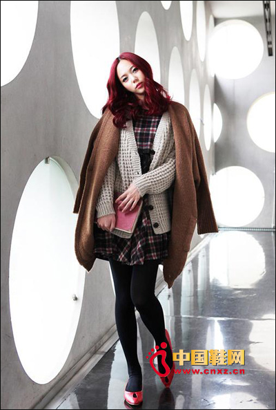 清麗的格紋短裙,混搭毛衣、外套和紅色平底鞋,時尚指數(shù)飆升