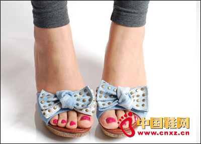 細致田園風情的鉚釘蝴蝶結牛仔布高跟拖鞋,純美又有個性的設計襯出一份可愛