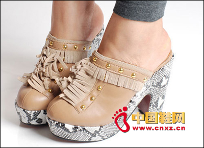歐美潮的流蘇鉚釘蛇紋反防水臺粗高跟拖鞋,絕對奪人眼球的設計閃亮迷人