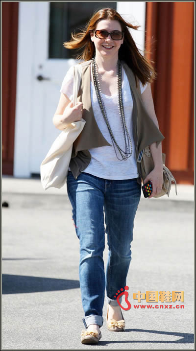 Alyson Hannigan就是最新肥皂美劇《老爸老媽浪漫史》(How I Met Your Mother)中飾小個子莉莉的那位可愛妞兒!她這次的亮點是用多條佛珠的項鏈搭配基礎(chǔ)款T恤牛仔褲,花朵平底鞋是很常見的款式,這樣搭配非常清新。