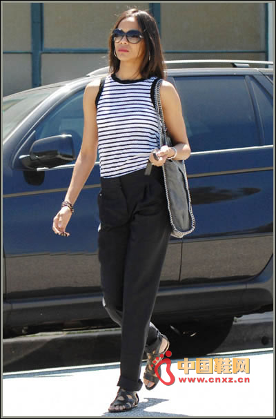 Zoe Saldana的街拍呈現(xiàn)出干凈利落的風(fēng)格,她這次帶來的是橫格紋簡單背心與OL風(fēng)格“蘿卜褲”的組合搭配,這位好萊塢頗受矚目的拉丁美女生就一副衣服架子,消瘦的身形加之自內(nèi)向外散發(fā)的強(qiáng)大氣場,什么服裝穿在她身上都好看。