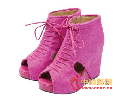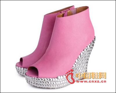 中國鞋網6月29日訊,粉色系列絕對是粉紅妹妹的最愛!其中一雙魚嘴窩釘坡跟踝靴相比其它幾雙更具特色,魚嘴涼鞋加上鋪滿窩釘的鞋跟,讓整雙鞋在甜美的基礎上多了些搖滾范兒,更有個性。