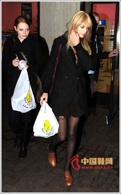 駝色布洛克鞋復古味道十足,搭配短裙、條紋襪營造性感女人味。