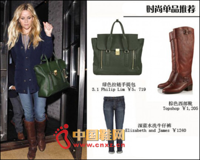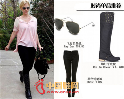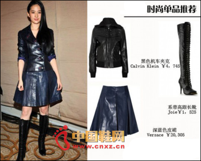 劉亦菲一身皮裝酷勁十足,黑色系帶高跟長靴十分挑人,稍一沒搭配好便有過激的嫌疑。與其與全身的皮衣皮裙相搭配,倒不如與輕松的裝束相搭配。