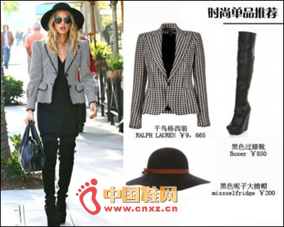 著名的好萊塢明星造型師Rachel Zoe一向都是潮流指標,這款黑色坡跟過膝靴保暖又舒適,搭配黑白千鳥格的西裝和一頂充滿法式風情的大檐帽,可以從頭暖到腳。