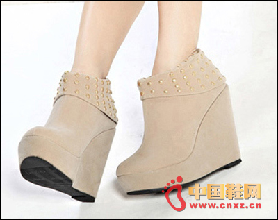 非常小女人的一款裸靴,超級坡跟的。上面是滿滿的鉚釘裝飾。純色的,靴身與靴底都是同色的款。非常的顯瘦。