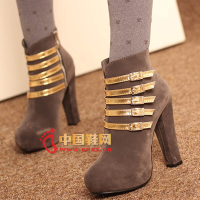 個性拼色搭扣內(nèi)增防水臺粗跟踝靴,時尚的金色搭扣設計,超帥氣,性感又百搭哦!