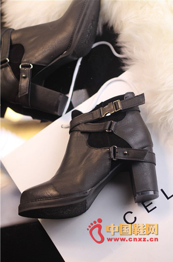 小粗跟軍靴,軍靴的設計造型非常帥氣,鞋面上加入了一塊搭扣的裝飾,一下變得很秀氣,鞋跟處也很特別,粗跟設計不會太累 ,搭配短裙啊,褲子都很好看。