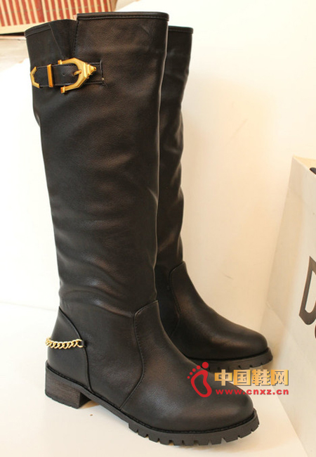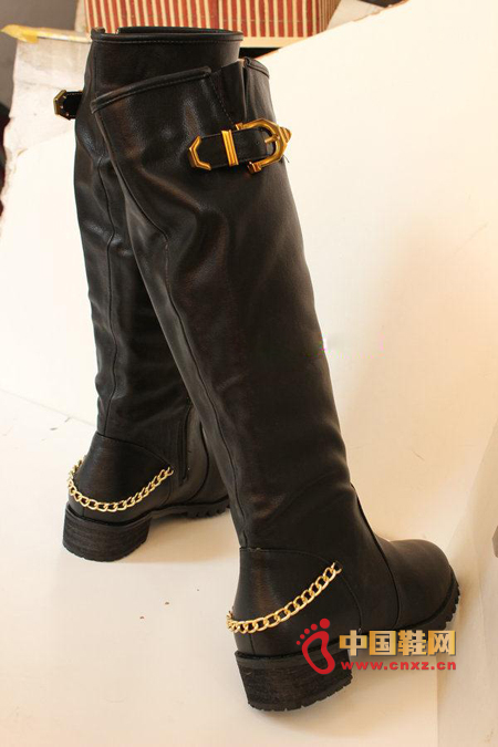 黑色皮質騎士靴,彰顯帥氣的氣質,側邊的小拉鏈凸顯細節的精致,后跟的鏈條和靴口的搭扣設計使中性范的氣質馬上提升。
