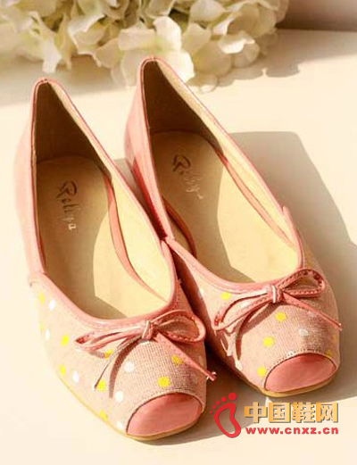 粉色平底單鞋,布滿俏皮的波點(diǎn)充滿小清新,蝴蝶結(jié)裝飾俏皮可愛,拼接的鞋頭大方清新。