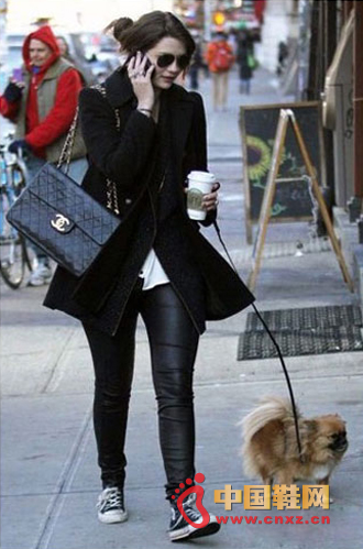 米莎·巴頓(MischaBarton)此次的搭配則是個失敗的范例。香奈兒這款經典包包端莊優雅,黑色短絨大衣穿出了冬季巴黎的味道。只可惜,緊身褲使她看起來很胖,搭配帆布鞋更是顯得不倫不類。如果搭配長靴則能改善腿部比例不調的問題。