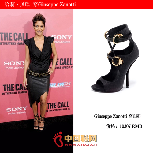 Giuseppe Zanotti每次設計鞋履都能展示出他那過人的細心及敏銳的時尚觸覺。細節嫵媚有力的線條加上金屬裝飾,華貴高雅又別具個性。Halle Berry一身黑色皮質連衣裙亮點就在于腰帶的一串金屬環與搭配的鞋子有相同的元素,整體的搭配很和諧。
