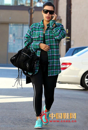 金-卡戴珊格子襯衫走Boyfriend路線 流蘇包包配水綠色跑鞋步履輕快。