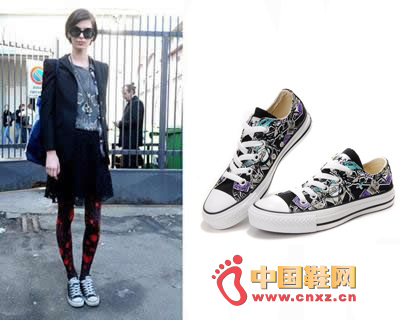 花式印花長褲是今年流行元素,再搭上一雙白色帆布鞋,多種不同元素的單品混搭出別樣的時尚風味,成為全場焦點。