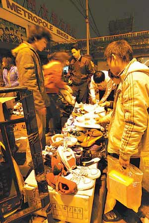 臨近過年,許多賣鞋的商家紛紛集體出動大甩賣,直到晚上11時多,廣州解放路大新路口兩旁行人道上還擺滿賣鞋的攤檔,買者絡繹不絕,一派熱鬧景象。
