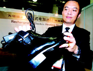 除了個性鞋墊外,帶充電器的皮鞋也吸引了不少好奇的目光。來自南通的一家廠家將充電設備與皮鞋連接,“每次充電以后,皮鞋可以在6個小時內保持25至38℃”。