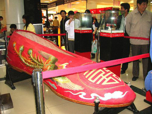 2006年11月,在江蘇昆山舉行的鞋文化節(jié)上,世界上最大的繡花婚鞋現(xiàn)身昆山商廈,讓市民連連稱奇贊嘆。據(jù)主辦方介紹,該繡鞋以中國傳統(tǒng)婚俗鞋花“龍鳳呈祥”為主題,全長2.8米、寬0.87米、高0.71米,重63公斤,鞋內(nèi)可寬敞地躺臥兩三個人。此鞋運用60多種真絲色線,10多種針法在紅色緞面上繡出栩栩如生的金龍彩鳳、祥云等圖案。