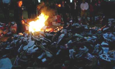 當天,氣溫驟降,室外冷風颼颼。國輝新廠門前空地上,五顏六色的成品鞋,堆放得如同小山一般高,鞋上的“國輝”標簽分外醒目。數百工人與公司管理人員一道,圍在四周,看著幾名工作人員向“鞋山”潑灑汽油。