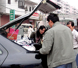 豪華小車后車箱當鋪面,載著號稱質(zhì)量絕對有保證的“走私”鞋子當街叫賣。